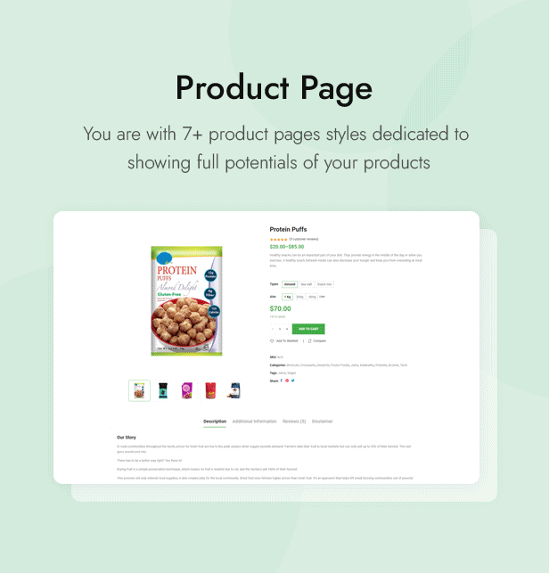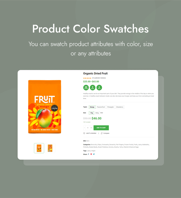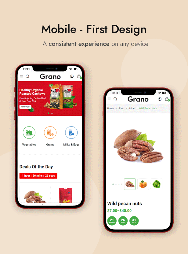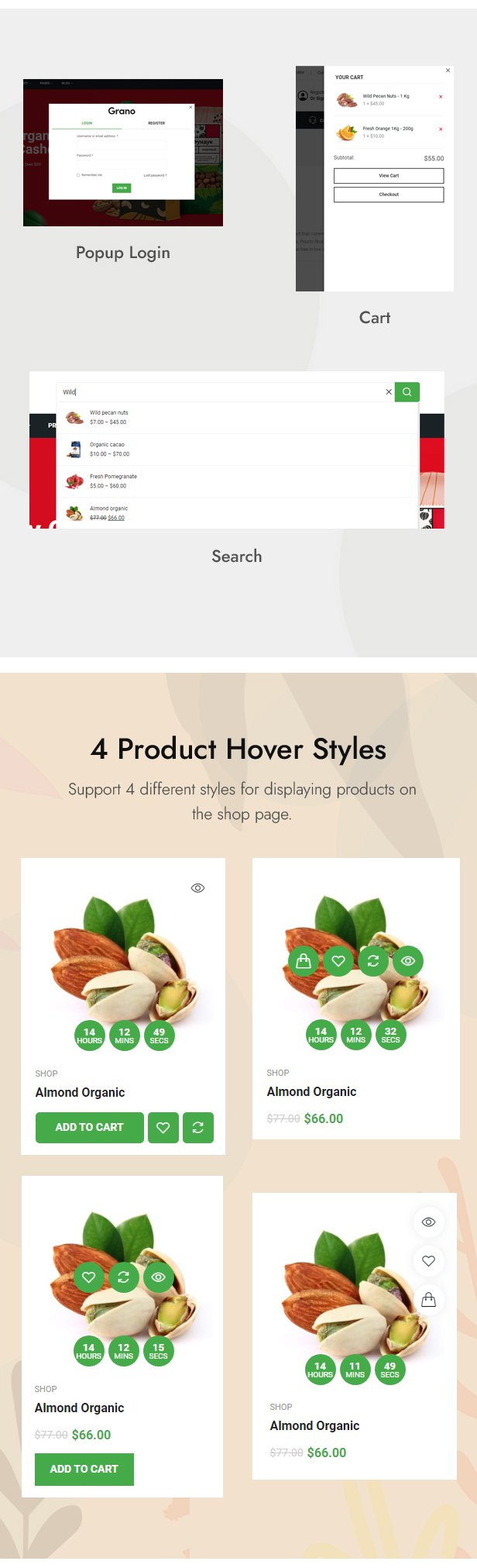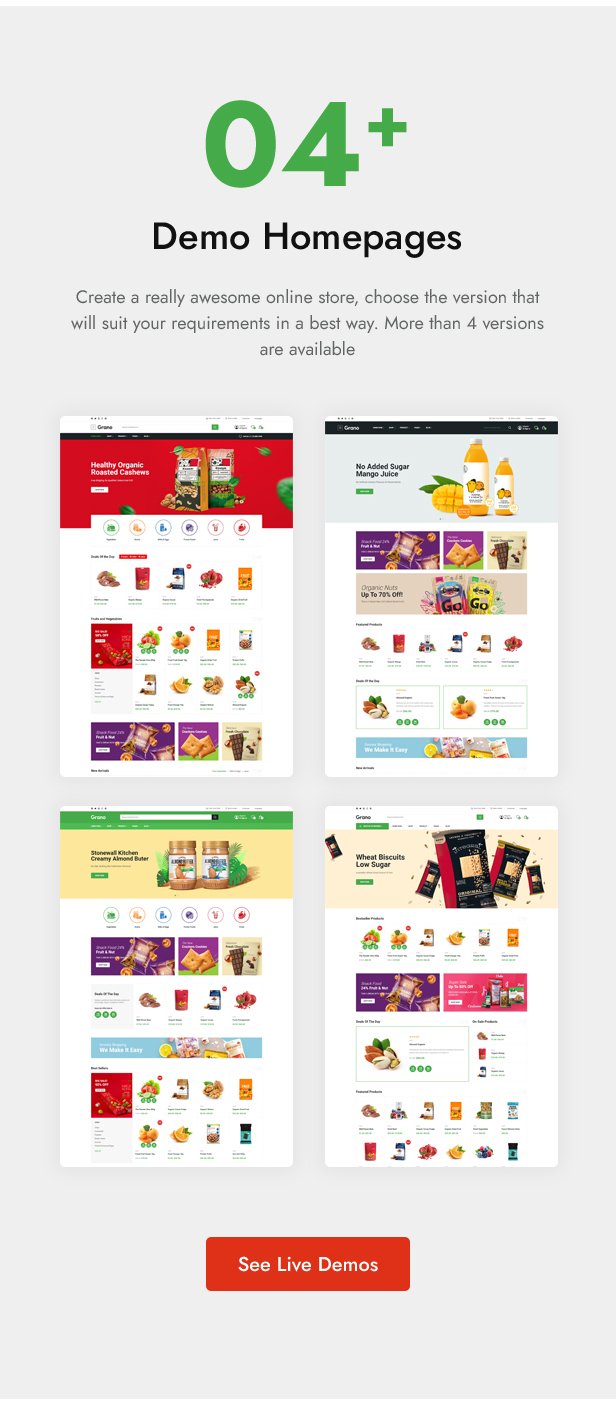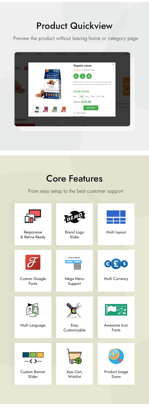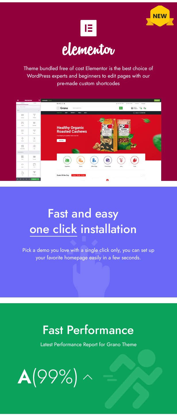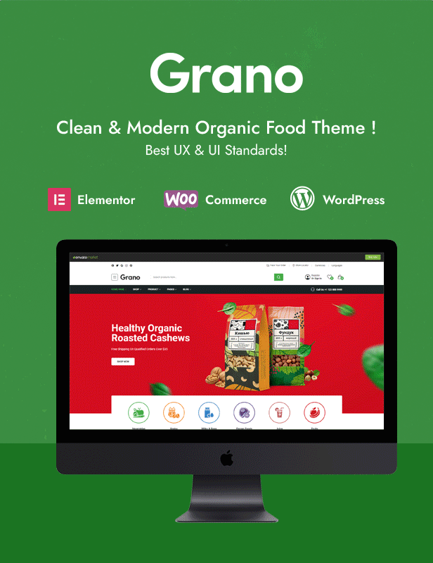 Grano là một giao diện WordPress tuyệt vời. Giao diện gọn gàng, hiện đại và linh hoạt này được xây dựng dành riêng cho ngành thực phẩm hữu cơ, cửa hàng hữu cơ, trang trại hữu cơ. Với thiết kế web responsive 100%, Grano – giao diện WordPress Thực phẩm hữu cơ giúp cửa hàng Thực phẩm của bạn trông thật ấn tượng, chuyên nghiệp và có thể tùy chỉnh cao trên các thiết bị khác. Giao diện dễ dàng cài đặt chỉ với vài cú nhấp chuột, Grano mang đến nhiều trải nghiệm thú vị cho khách hàng. Megamenu dọc và ngang hiển thị danh mục sản phẩm và liên kết đến Blog, trang đặc biệt và sản phẩm với hình ảnh và văn bản đẹp mắt. Danh mục nổi bật được hiển thị với hình ảnh nổi bật của các danh mục đó trên thanh trượt và dễ dàng thêm vào bảng quản trị. Logo thương hiệu và logo thương hiệu yêu thích của bạn được hiển thị trên thanh trượt. Tab Sản phẩm hiển thị danh mục sản phẩm trong mỗi tab hoặc mỗi hàng hoặc mỗi cột. Tạo nội dung và bố cục với plugin Elementor: trình chỉnh sửa kéo và thả, thêm thành phần dễ dàng và nhanh chóng. Ưu đãi hàng ngày hiển thị bộ đếm ngược tại mỗi sản phẩm giảm giá. Ajax Search, WooCommerce giúp khách hàng tìm kiếm sản phẩm yêu thích, sản phẩm cần thiết. Header và Footer chứa các biểu tượng mạng xã hội, liên kết đến các trang khác như giới thiệu về chúng tôi, trang giao hàng, trang thương hiệu,… Hãy cùng khám phá những tính năng tuyệt vời của chủ đề Grano WooCommerce để bắt đầu tạo trang web của bạn ngay bây giờ!