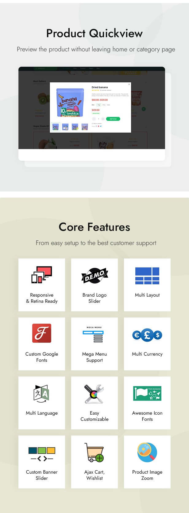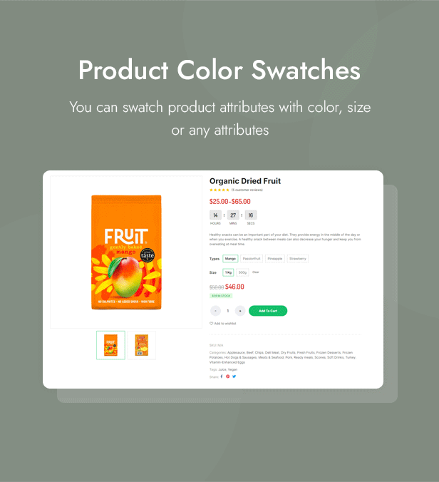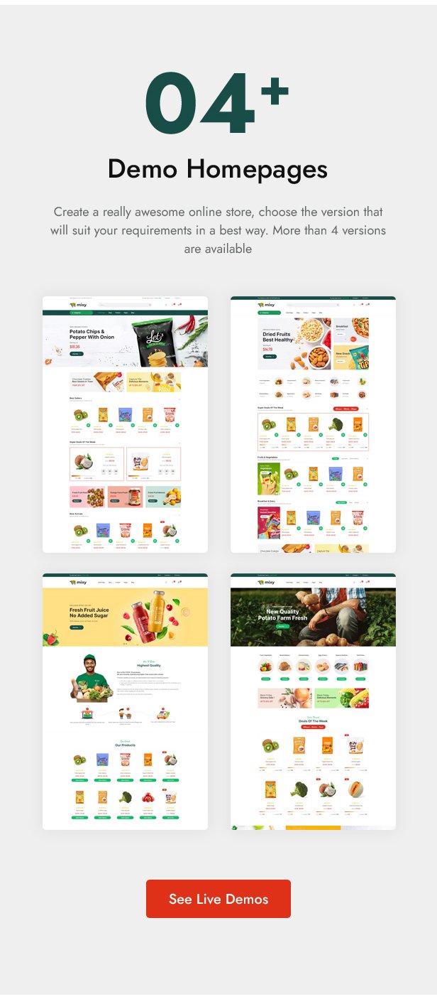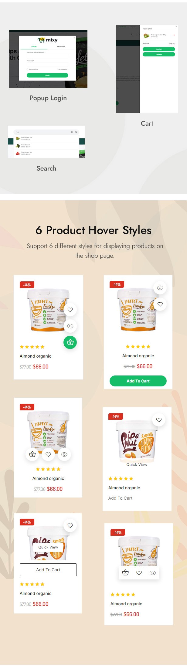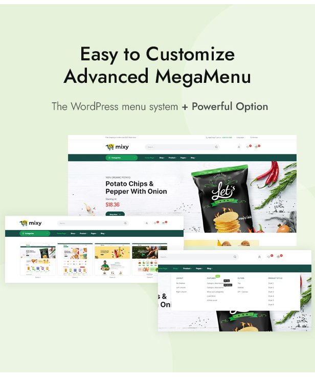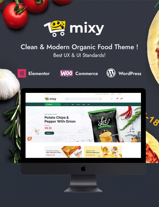 Mixy Organic là một theme WordPress tuyệt vời được thiết kế đẹp mắt, hoàn toàn phù hợp với bất kỳ cửa hàng trực tuyến siêu thị, thực phẩm tươi sống, thực phẩm hữu cơ, cửa hàng rau củ, đồ uống hữu cơ, sản phẩm chăm sóc sức khỏe tự nhiên nào. Với thiết kế web responsive 100%, theme WordPress Mixy Organic giúp cửa hàng của bạn trông thật ấn tượng, chuyên nghiệp và có thể tùy chỉnh cao trên mọi thiết bị. Tùy chỉnh màu sắc, phông chữ, hình nền, bố cục header và footer, kiểu trang sản phẩm, lưới sản phẩm, số lượng sản phẩm trên mỗi trang trong bảng quản trị mà không cần chỉnh sửa mã. Chỉnh sửa nội dung mà không cần chỉnh sửa mã với Elementor Page Builder: Trình chiếu, Biểu ngữ, Tiêu đề, Danh mục, Sản phẩm Tab, Sản phẩm Giảm giá, Đếm ngược, Logo Thương hiệu, Lời chứng thực, Blog. WooCommerce giúp bạn quản lý hoạt động kinh doanh hiệu quả. Vẫn còn rất nhiều tính năng tuyệt vời của theme Mixy Organic, hãy cùng khám phá!